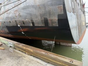 A lot of logistics and labor were involved in order to finish this job on time. 2 launch boats were travelling between Galveston and the vessel daily. The cargo tanks had to be cleaned and the heating lines to be pressure tested and repaired. Our highly qualified plumbers were able to replace and solder the special AL BR pipes and fittings. Another damage on the vessel's shell plate was also repaired during this time.